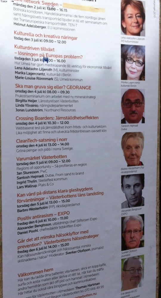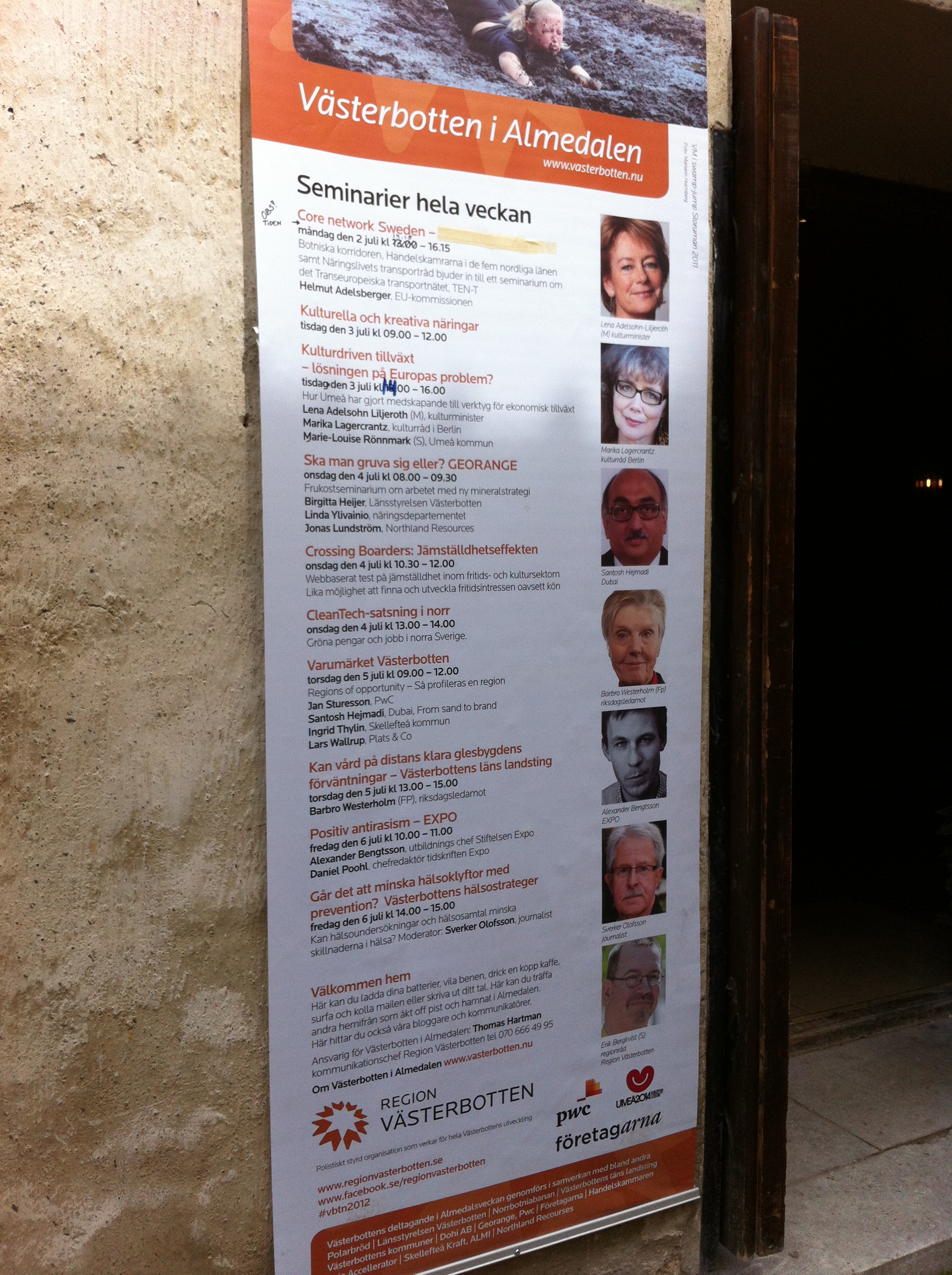 Thomas berättade bland annat att det koncept Region Västerbotten har jobbat fram är så attraktivt för intressenterna i Västerbotten att de själva vill vara med och satsa – för att de själva får ut så mycket av den regionala närvaron i Almedalen. Region Västerbotten har därmed kunnat samla resurser att ha ett gemensamt hus 100 meter från Donners plats (centrum för alla aktiviteter under veckan), anordna välbesökta seminarier, kort sagt göra allt det som hör till en seriös aktör under Almedalsveckan, utan att det kostar skjortan.