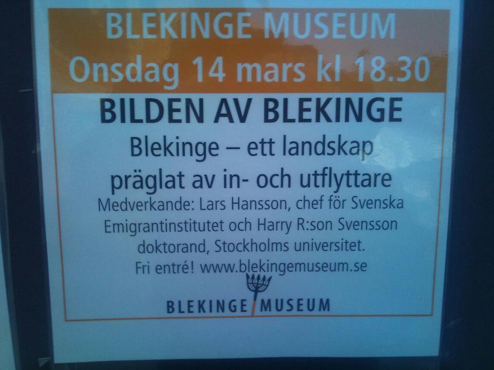 Bilden av Blekinge ska prövas och de olika bilderna av Blekinge ska presenteras. Ikväll är det om landskapet präglat av in och utflyttare. Finns anledning fundera på integration, historieskrivning mm.