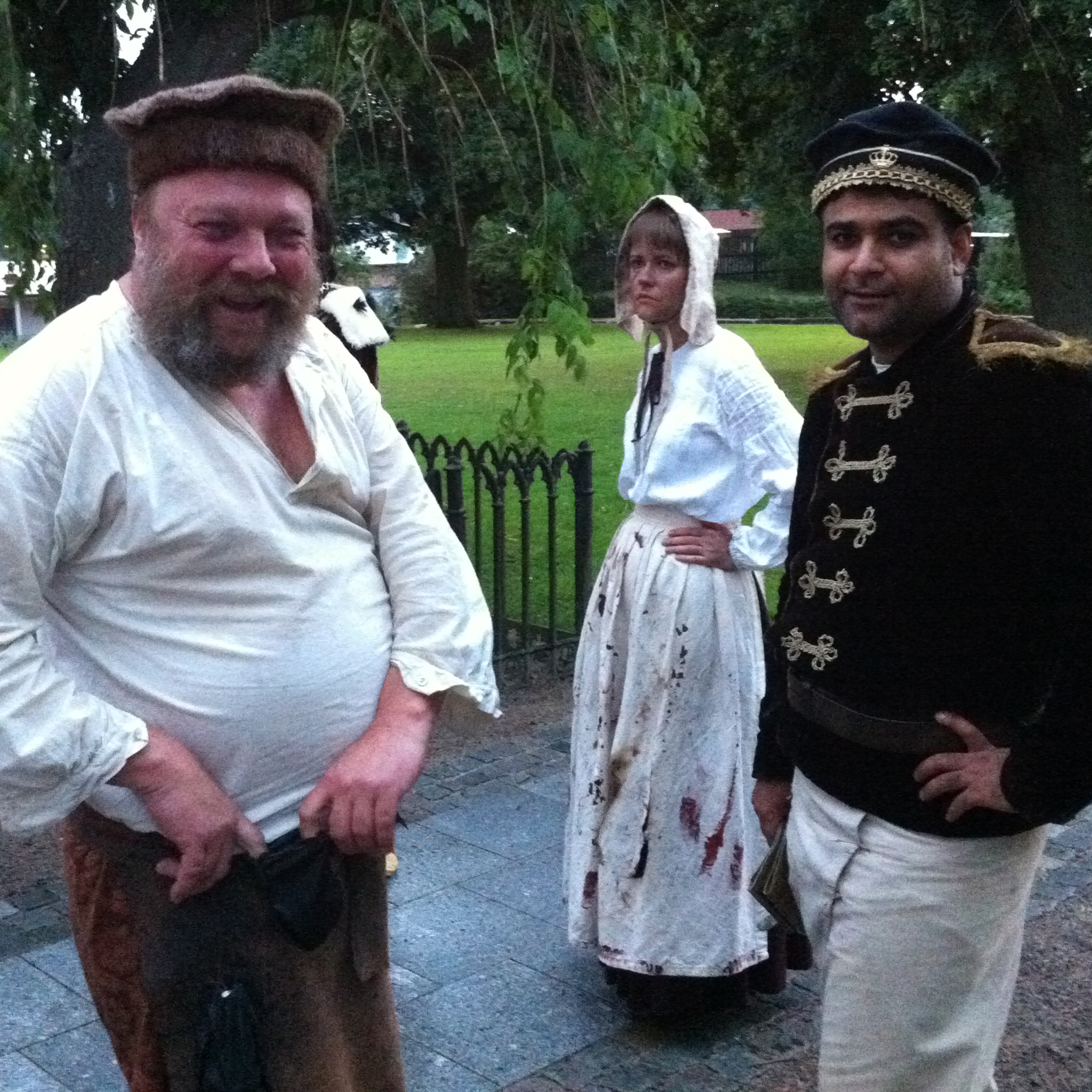 I sommarteatern ”Blodbadet, en helt ny historia” deltar publiken i stället genom att röra sig i den befintliga scenografin som samtidigt är den plats där det verkliga blodbadet utspelade sig. Vi uppmanas alla fly in i kyrkans (bedrägliga) säkerhet när en fruktansvärd övermakt i form av svenska och finska trupper är på väg att bryta igenom försvarslinjerna. Det greppet fungerar, liksom det mesta i denna föreställning som är väl värd att se oavsett om man är intresserad av historia eller ej. Nu är det inte många föreställningar kvar, men jag tror att det blir fullspikat bara vädret är lika gynnsamt som på torsdagsaftonen. Regnet kom först sedan vi alla tagit oss in i Heliga Kors Kyrka.