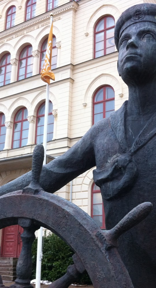 Visar bild på Nils Holgersson-statyn vid Amiraliteskyrkan. Är idag en sevärdhet. Pojken springer mot Rosenbom. Det gäller att kunna tolka signalerna.